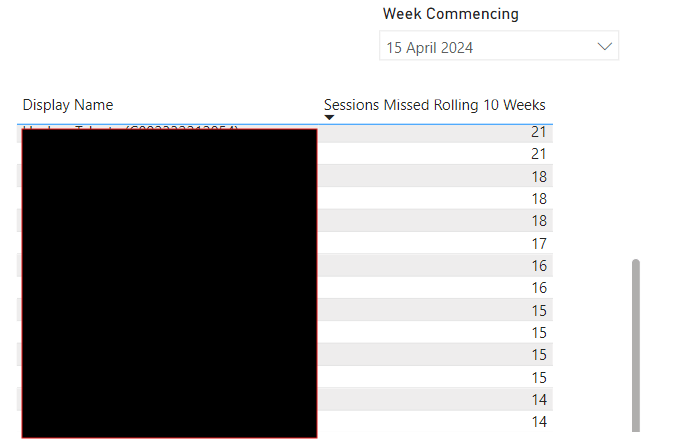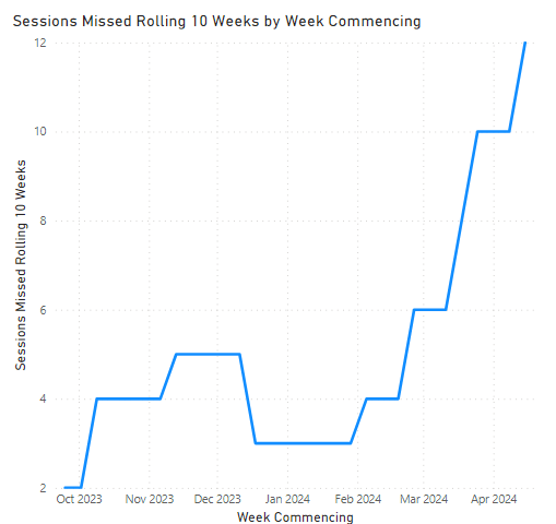 With a student selected, because the measure is dynamic and not pre-aggregated when the model is loaded, you can see how this changes over time. In the below example the selected student had been missing around 3-5 sessions in the rolling 10 week windows up until the middle of February when clearly “something changed”: